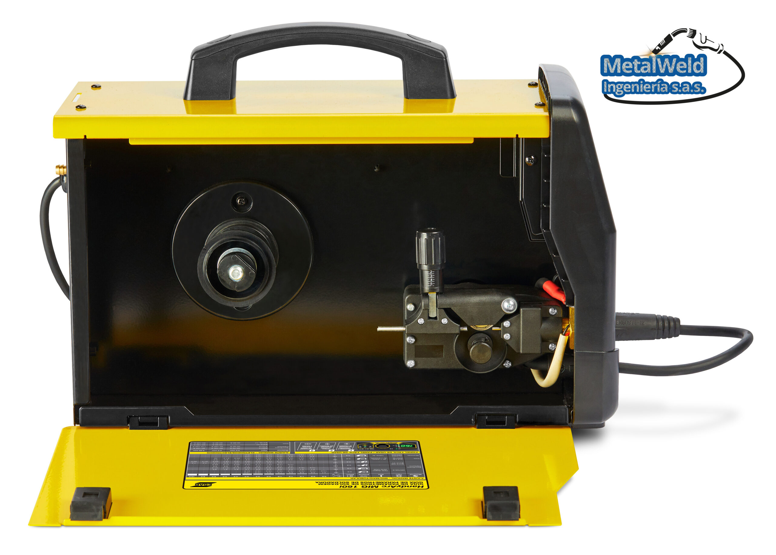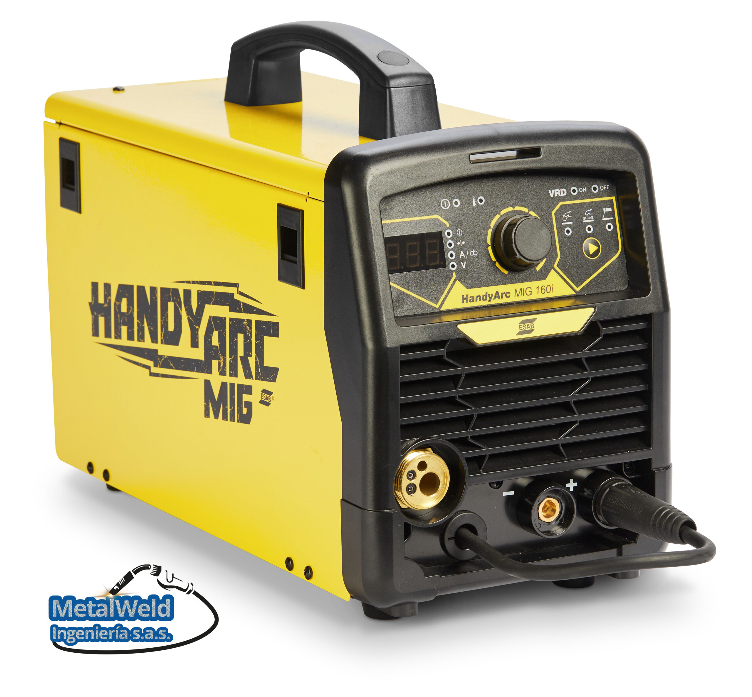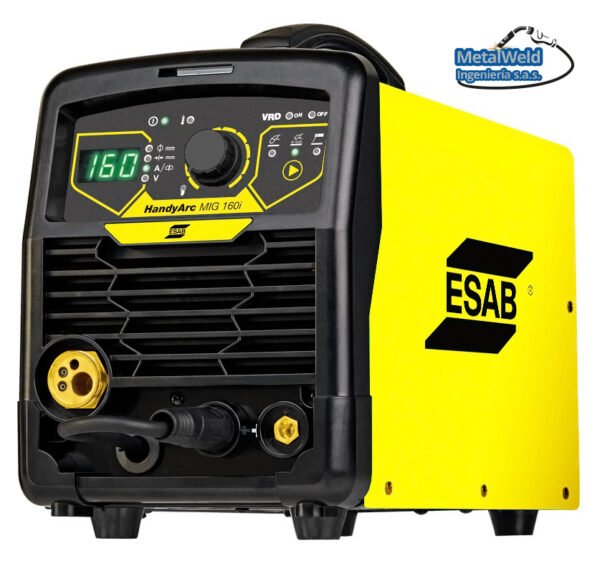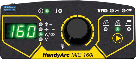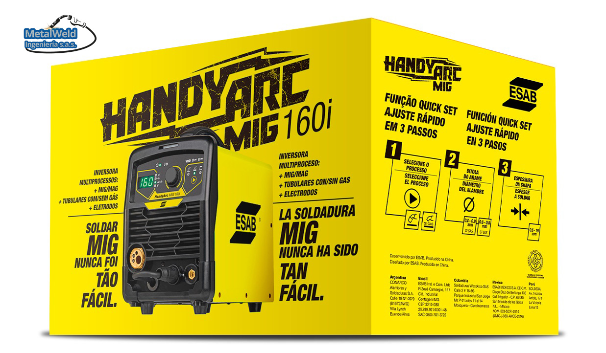 El equipo para Mig y electrodo ESAB HANDYARC MIG 160i es una fuente de poder inverter para soldadura MIG/MAG, alambres tubulares y electrodos, con estructura liviana y pequeño volumen, para trabajos de mantenimiento en campo y en taller. El alimentador de alambre está diseñado para cargar bobinas de 5 kg de alambre hasta 0,9 mm, con funcionalidad para parametrización rápida a través de la exclusiva tecnología Quick Set: basta configurar el espesor del