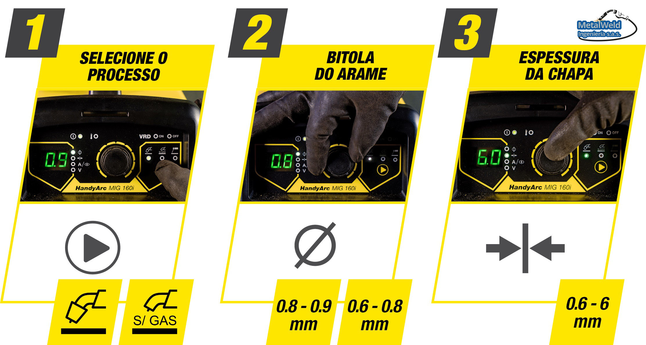 material base y el diámetro del alambre en el panel del equipo para que la tensión del arco y la velocidad de alimentación de alambre se ajusten automáticamente.